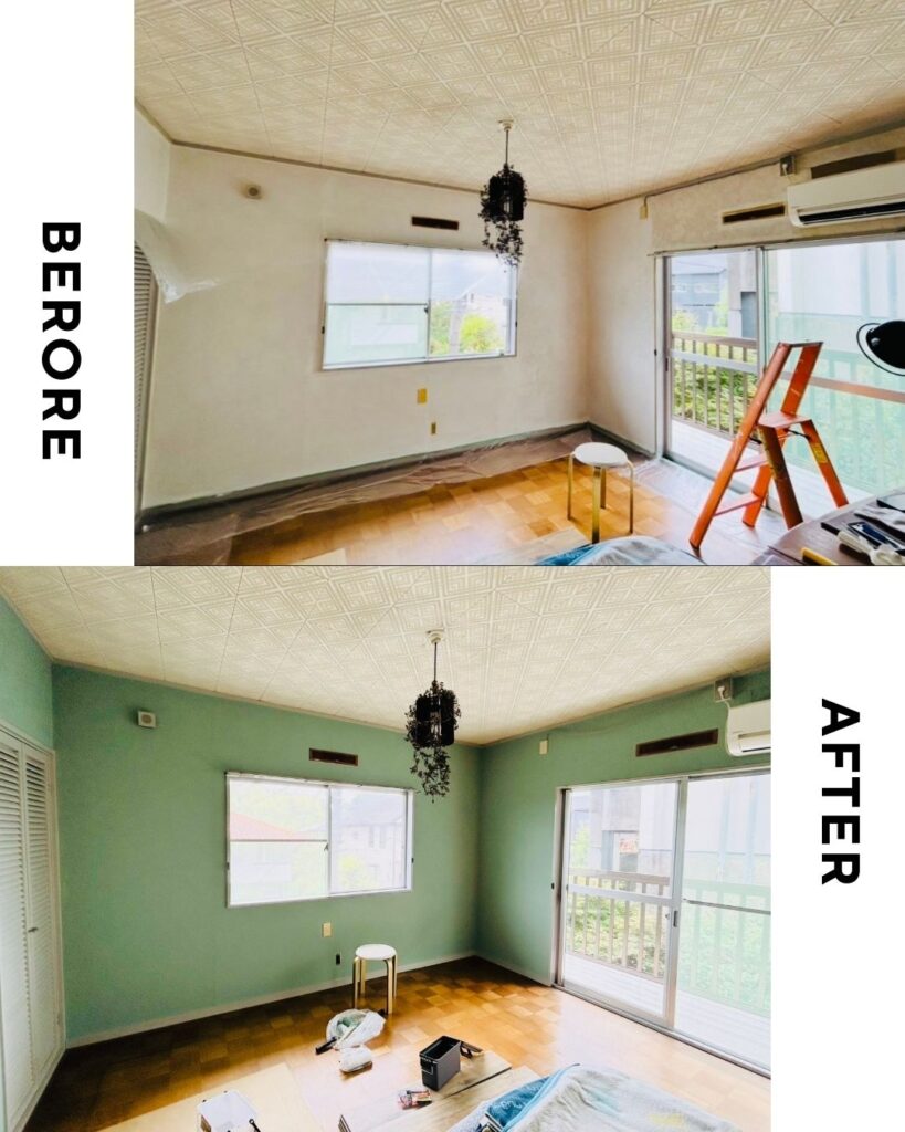 白いシンプルなお部屋から、グリーンの穏やかな色味がお部屋全体に広がり、素敵な空間に仕上がりました◎