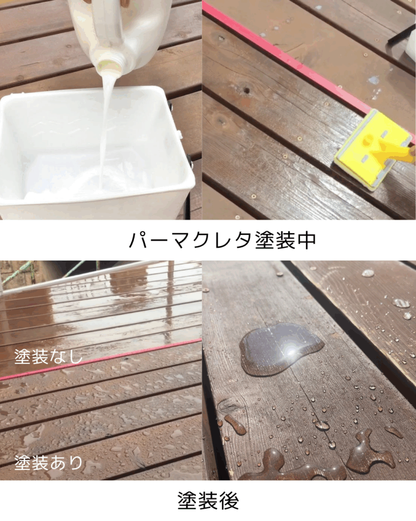 撥水効果は持続的に続き、藻が生えたウッドデッキを水で洗浄するだけで、汚れたコンクリートを水で洗浄するだけで元通りに。